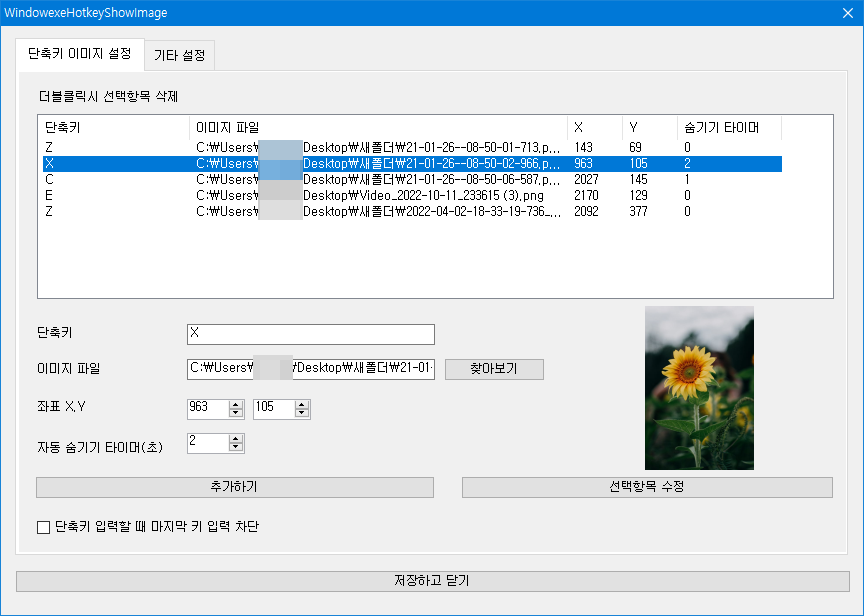 원하는 단축키 누르고 이미지 파일 선택, 표시 위치 지정, 타이머 수정(일정 시간후 자동 숨기기)하고 추가하기를 클릭하세요.