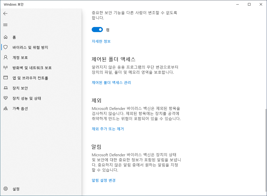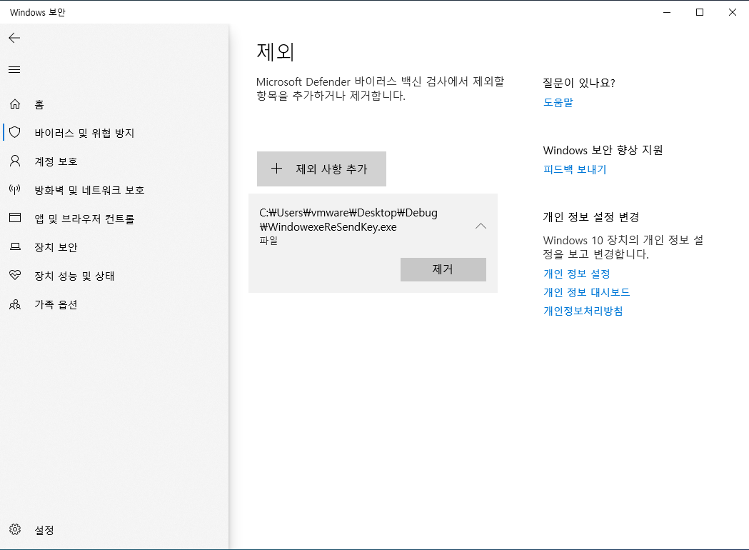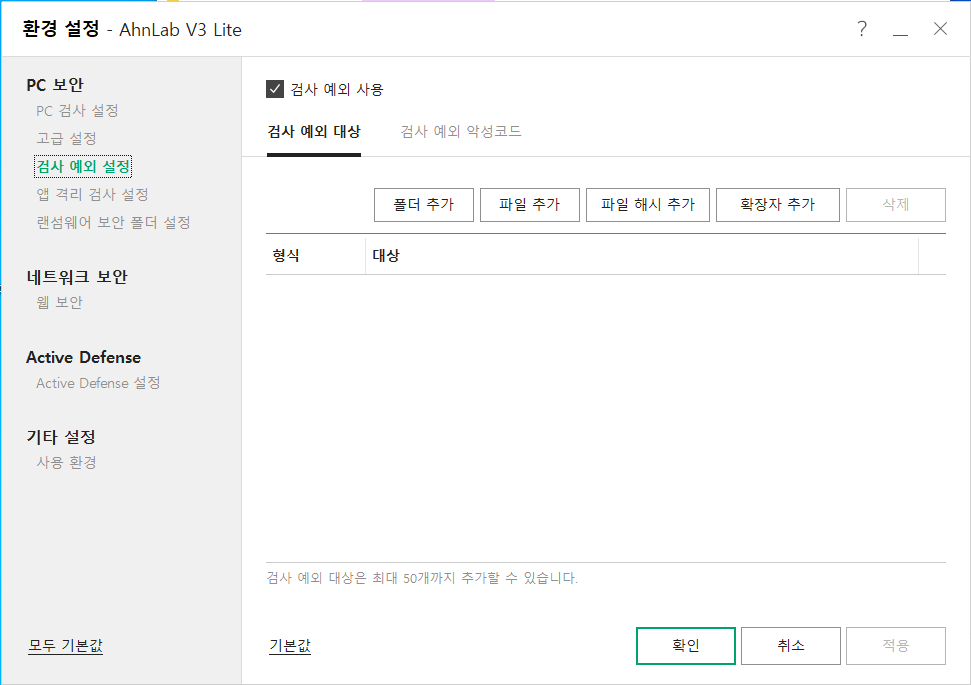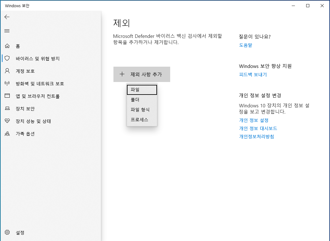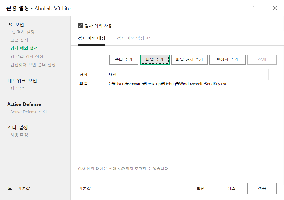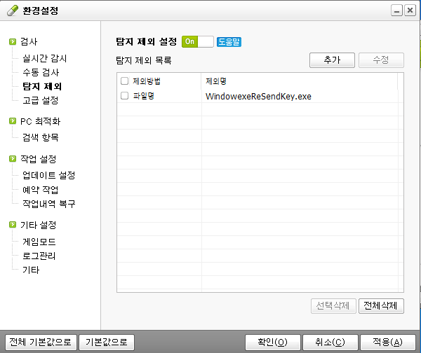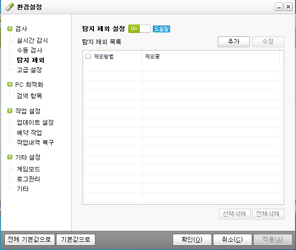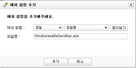 환경설정 - 탐지제외 클릭, 추가 클릭