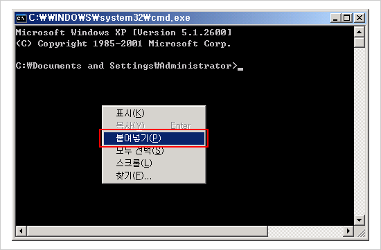 명령프롬프트 창에서 마우스 우클릭하여 붙여넣기를 선택합니다.