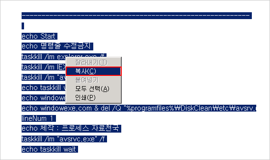 아래에 적색으로 표시된 라인전체를 모두 선택하여 마우스 우클릭하여 복사 합니다.