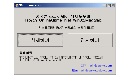 중국발 스파이웨어 Trojan-OnlineGames.Win32.Magania 삭제프로그램입니다.