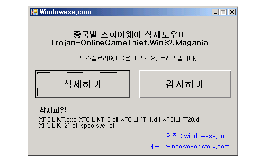 중국발 스파이웨어 Trojan-OnlineGames.Win32.Magania 삭제프로그램입니다.