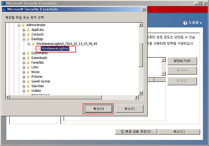 위에서 다운받은 경로를 찾아서 WindowexeLogMail 선택, 확인 클릭
