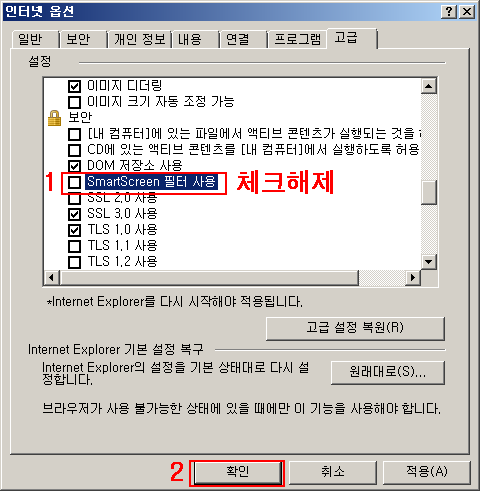[도구] - [인터넷 옵션] - [고급]에서 SmartScreen 필터 사용에 체크해제