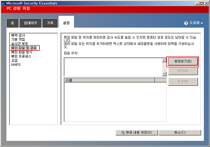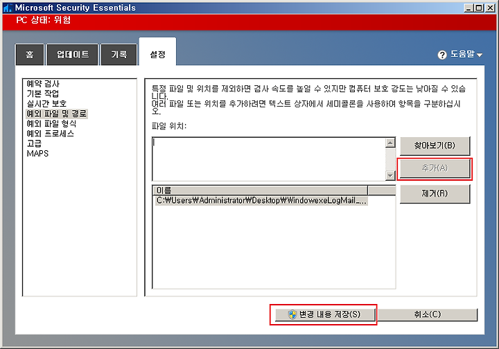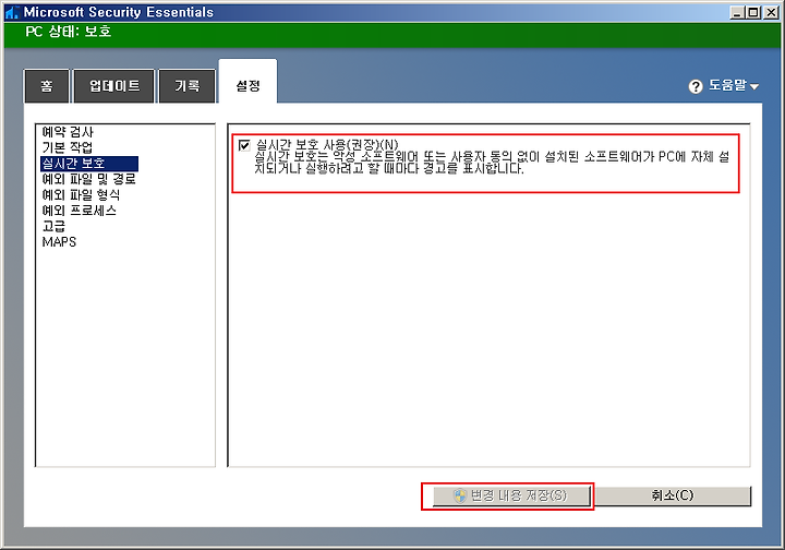 설정 - 실시간 보호 체크해제 후 변경 내용 저장 클릭