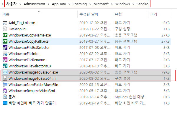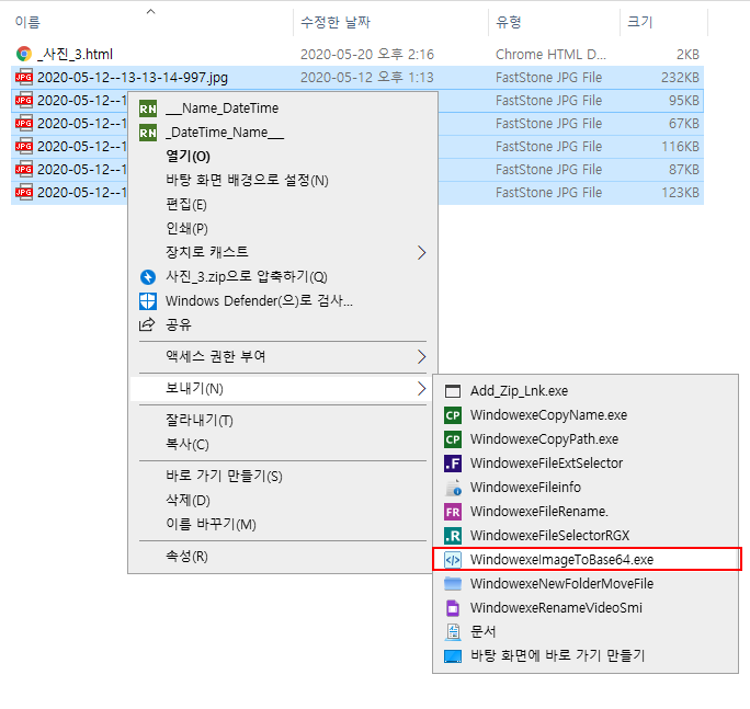 탐색기에서 변환하고자 하는 사진파일을 여러개 선택하고 보내기 - WindowexeImageToBase64.exe 파일을 선택하세요.