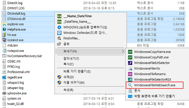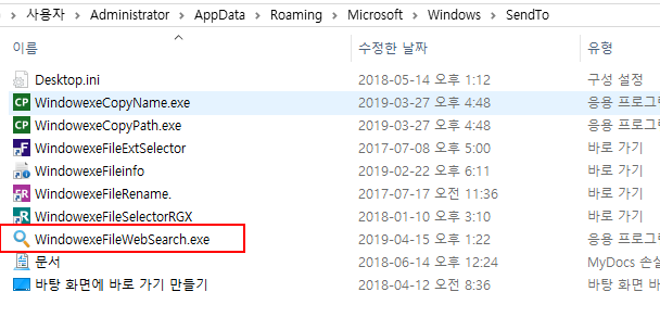 탐색기에서 원하는 파일을 선택하고 보내기에서 WindowexeFileWebSearch 를 클릭하세요.