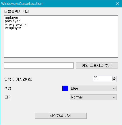 입력 대기시간, 색상, 크기를 원하는 값으로 변경하고 저장하기를 누르면 됩니다.