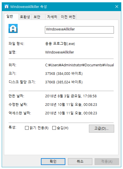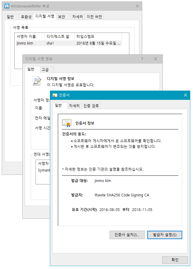 디지털 서명 인증서 사용시에 보이는 프로그램 속성.