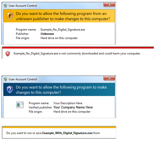 인증서가 있고 없을때에 실행시 뜨는 메세지의 차이.